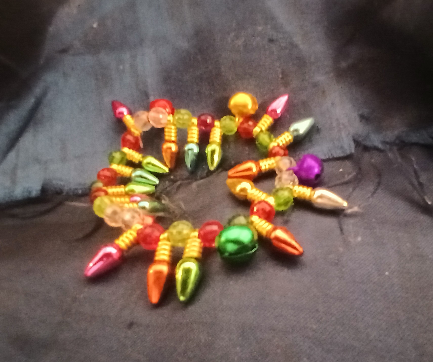 Red white and green beads surrounding xmas light charms and large jingle bells